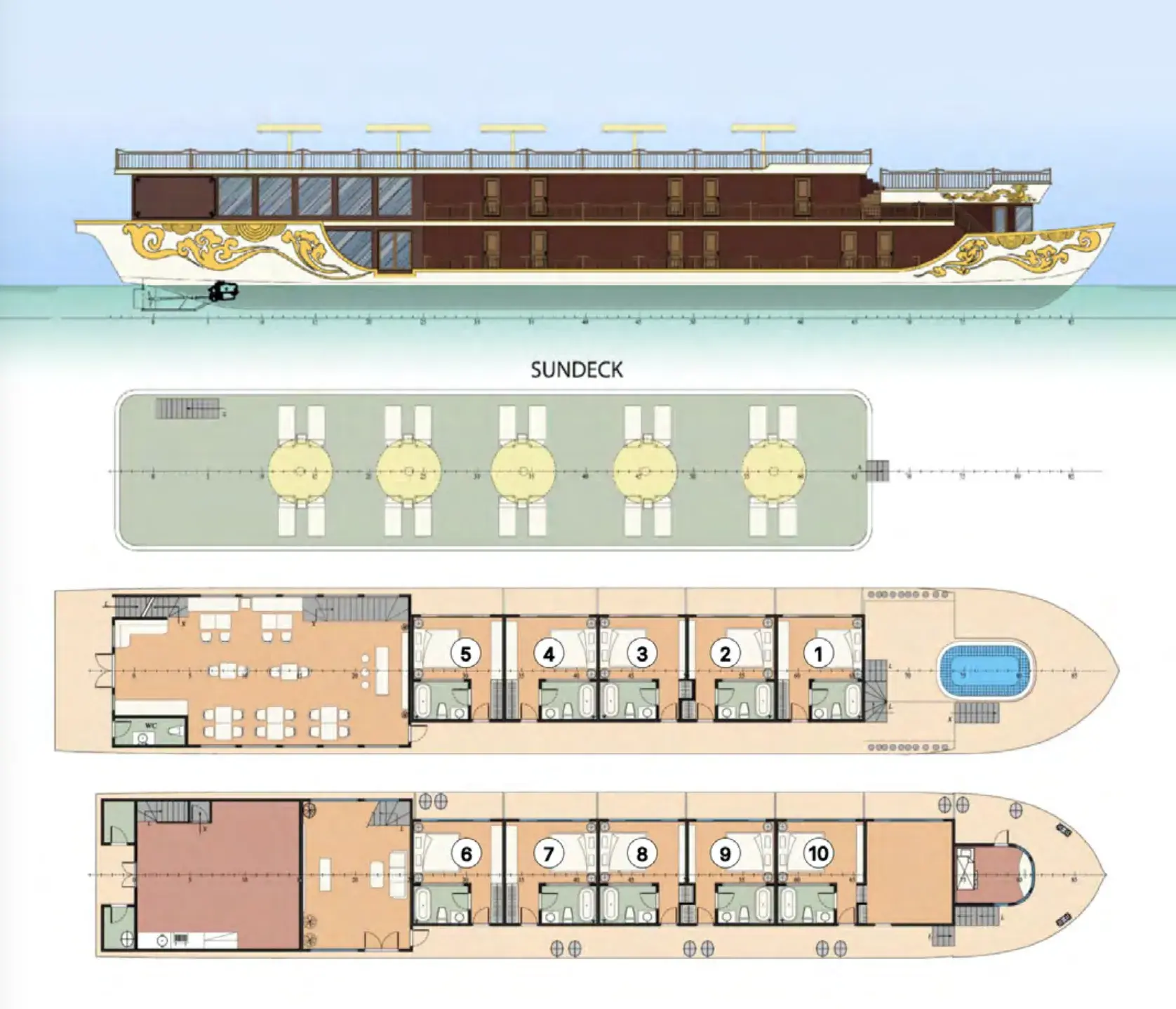 Гостей ждёт ресторан с авторской кухней, джакузи и лаундж-зоны на верхней палубе, а также спа-пространство для полного расслабления. Внутренние и открытые зоны спроектированы так, чтобы обеспечить комфорт, тишину и личное пространство.